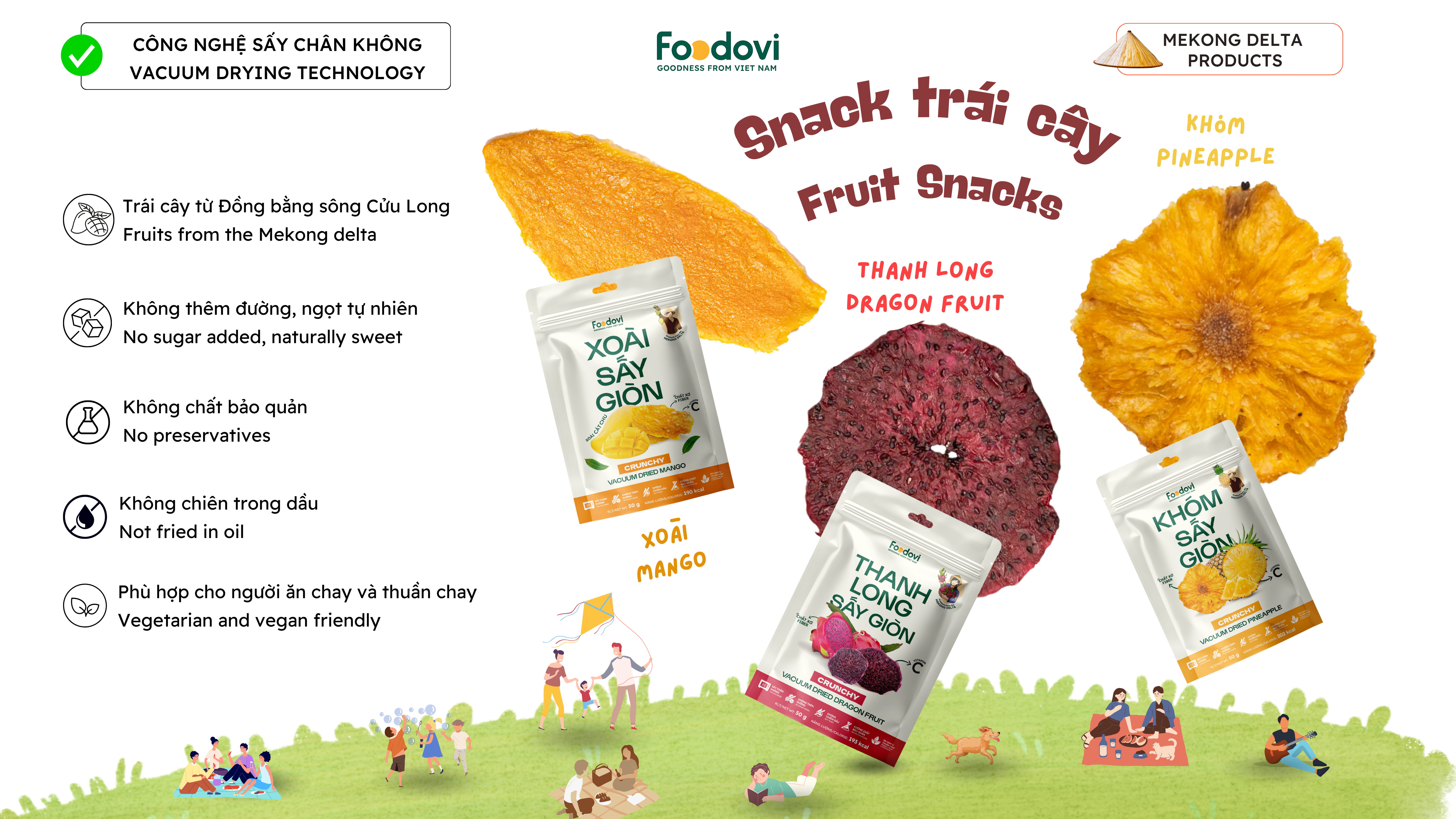 As young individuals of Generation Y, Foodovi always strives to create new values from the abundant and diverse fruit sources of our homeland—the Mekong Delta. Using vacuum drying technology, we produce crispy fruit snacks that are oil-free, with no added sugar or preservatives, aligning with the healthy and convenient snacking trends of both domestic and international consumers.